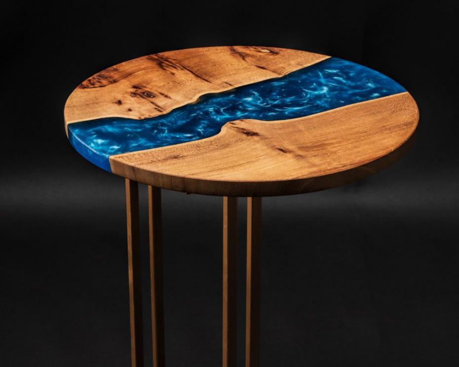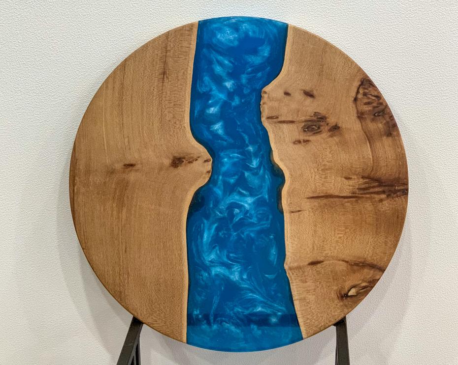 天板の中央を川のようにブルー系レジンが流れる一枚です。